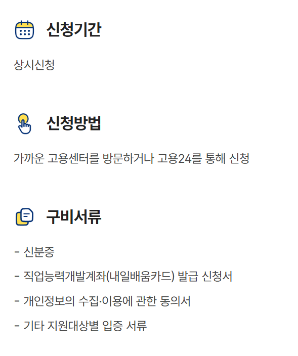- 오프라인: 고용센터 방문 → 신분증 지참 후 신청