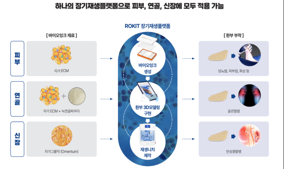 로킷헬스케어는 AI와 3D 바이오프린팅 기술을 활용하여 맞춤형 장기 재생 솔루션을 제공하는 바이오테크 기업입니다. 주요 제품으로는 'Dr. INVIVO 4D2D' 프린터와 일회용 재생 키트 등이 있으며, 피부 재생, 연골 재생, 신장 재생 등 다양한 분야에 적용됩니다. 현재 미국 FDA, 유럽 CE 인증을 획득하고 46개국에 수출 중입니다.
