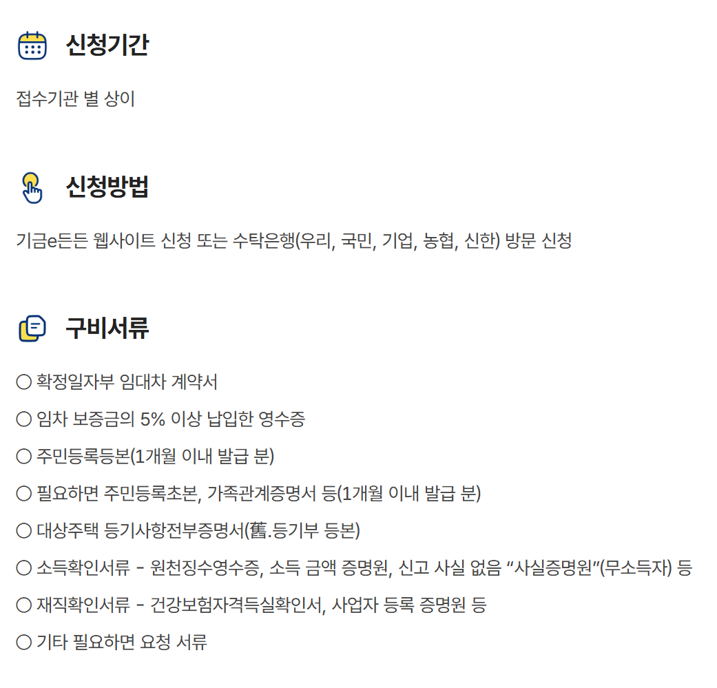 | 필요서류 | 신분증, 소득증명, 전세계약서 등 |