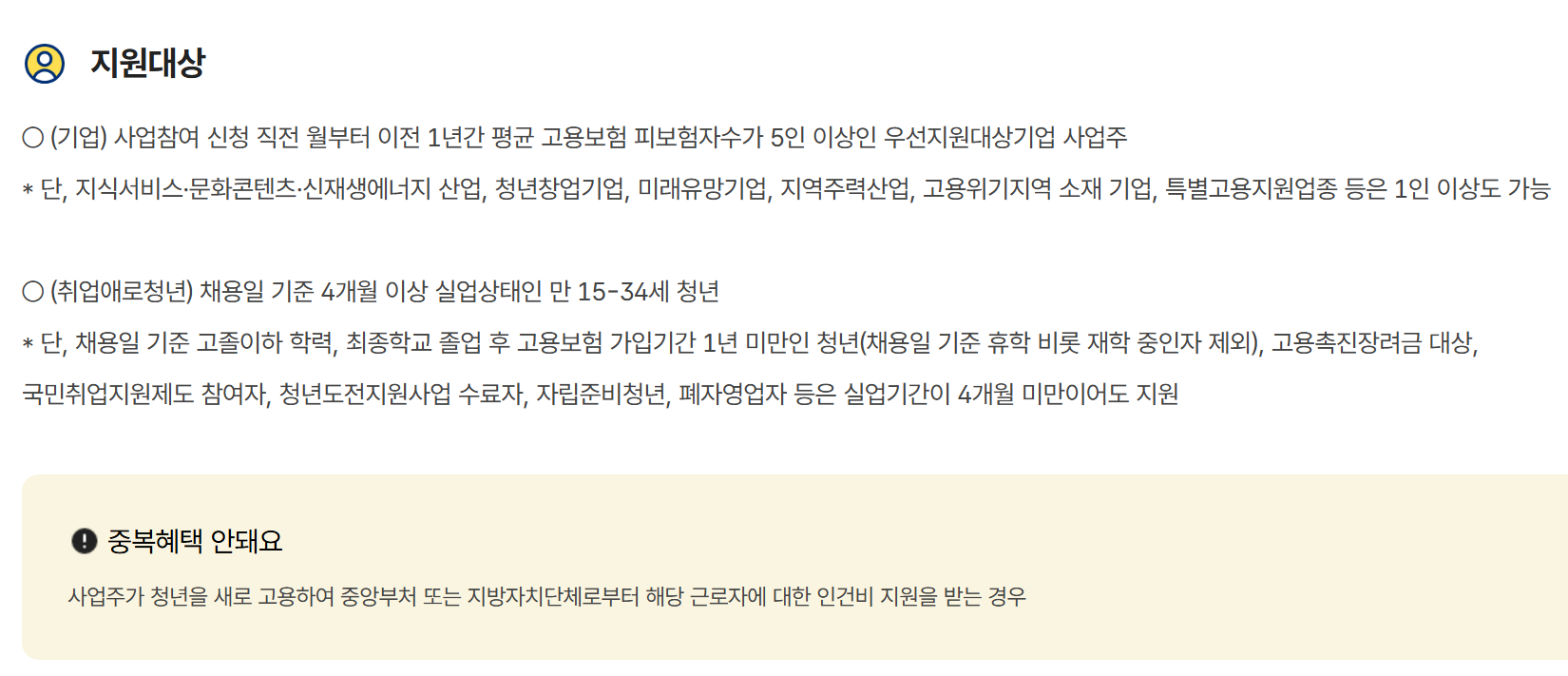 - 다른 청년고용지원금과 중복 불가 → 중복 수혜 방지!